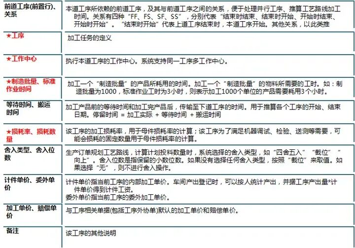 用料计划,上面是工艺路线。 2、字段解释——工艺路线
