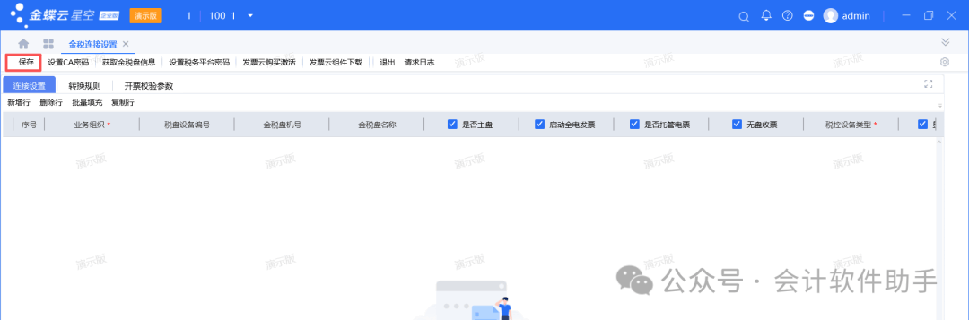 备注:因未连接金税盘信息,无法显示相关金税盘信息图片。 (3)再点击金税连接设置界面左上角的保存按钮,金税盘相关的信息就会自动回填到金税连接设置对应的分录行里。