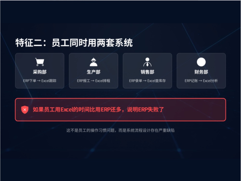 特征二:员工同时用着两套系统采购部:ERP里下单,Excel里跟踪;生产部:ERP里报工,Excel里排程;销售部:ERP里录单,Excel里查库存。 如果员工每天用Excel的时间比用ERP还多,说明ERP失败了。