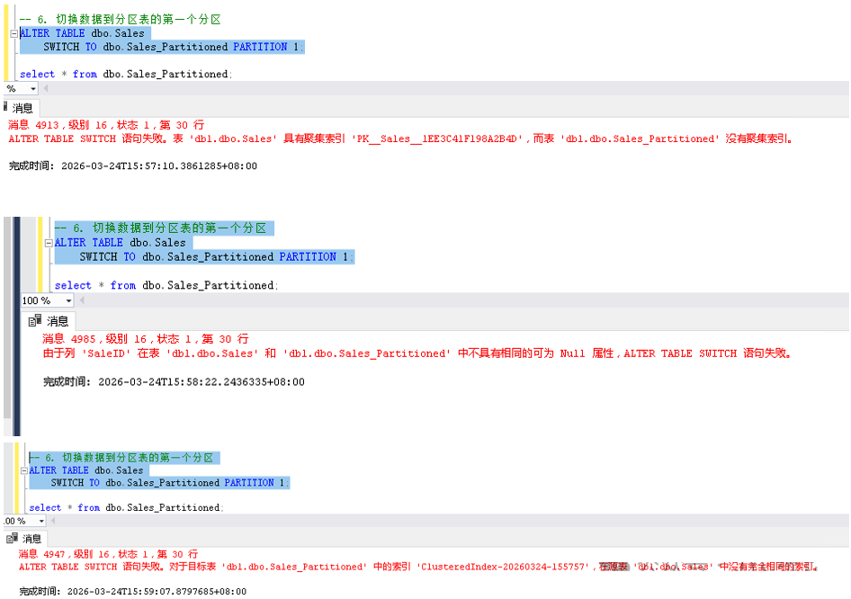 ALTER TABLE dbo.Sales SWITCH TO dbo.Sales_Partitioned PARTITION 1;select * from dbo.Sales_Partitioned;