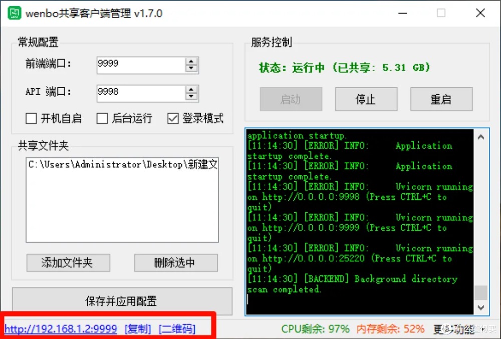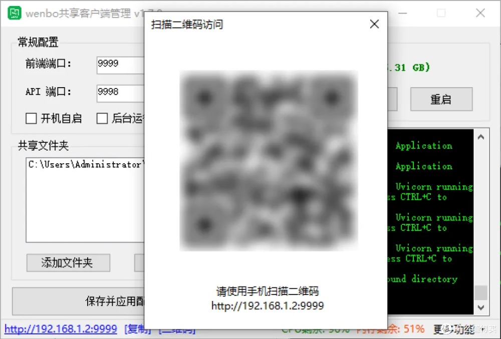 启动后,左下角会显示访问地址(电脑端)和二维码(手机端),扫码即用。