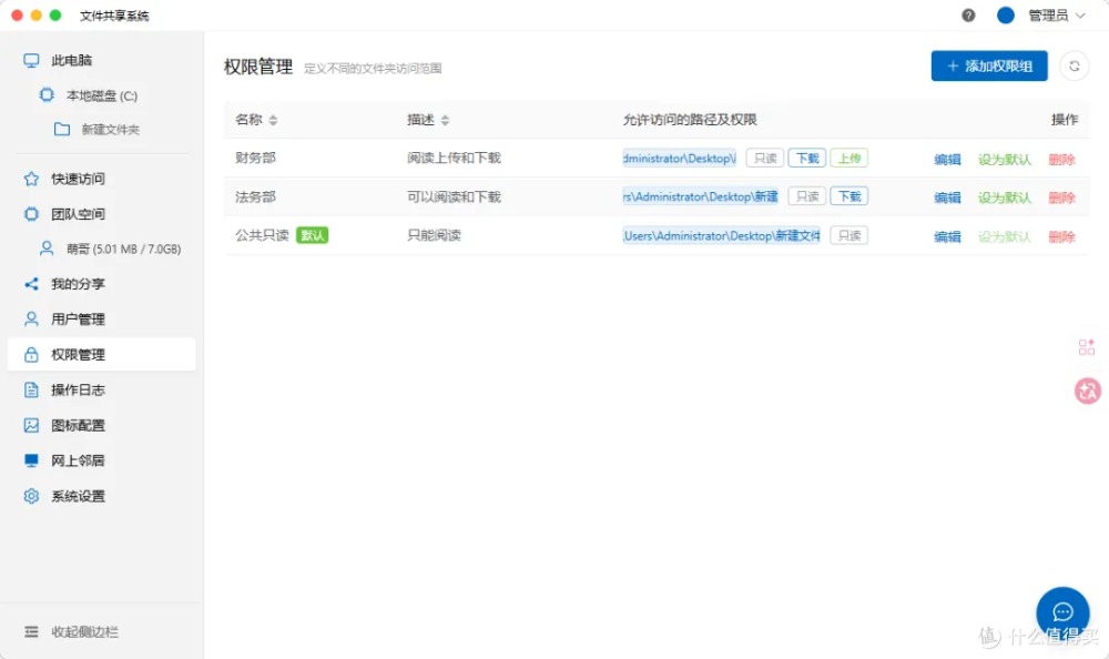 创建多层级权限组(如法务部、财务部),用户入组即继承权限。