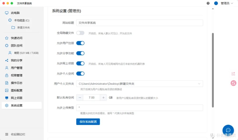 自定义系统标题、开启用户自注册、启用外链分享、激活网上邻居、分配个人空间……按需开关,自由度极高。