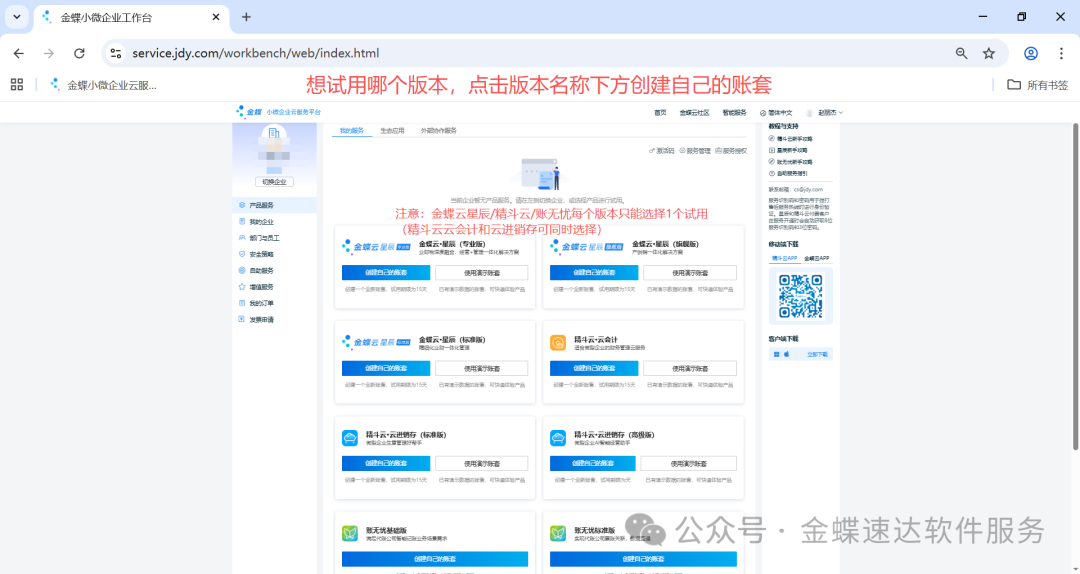2、电脑登录网址 jdy.com,登录刚刚注册账号,点击【登录】,输入账号及密码,登录后选择想要试用的版本,点击【创建自己的账套】即可试用