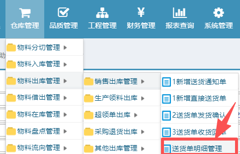 提交即可查询到对应的送货单;菜单为仓库管理-物料出库管理-销售出库管理-送货单明细管理:如下图所示: