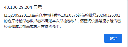 点晴ERP提示:当前仓库物料卷料的待检批号的仓库待检品卷数-3卷不满足本次品检卷数3,请查询该批号流水是否已经调整成合格品或者不在待检仓中,如何解决?